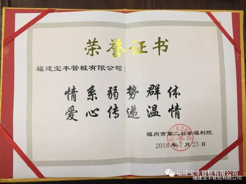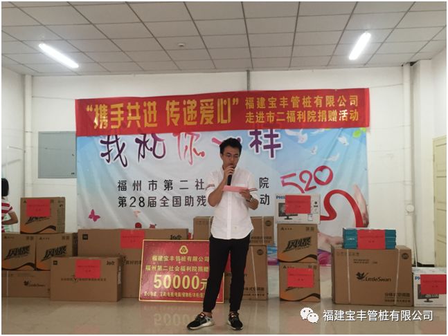 他在仪式上表示作为一家有社会责任感的民营企业,我们一直把关注社会公益事业、重视社会责任、做优秀企业公民当作我们企业文化的重要组成部分,并一直引导着我们前行!福建宝丰管桩有限公司在创造企业价值的同时,也致力于开展各项社会公益活动,做到取之于社会,回馈于社会。