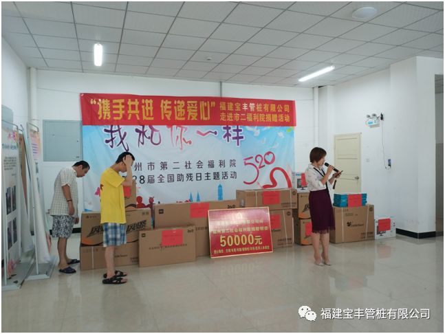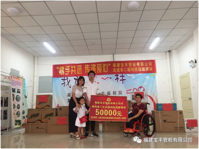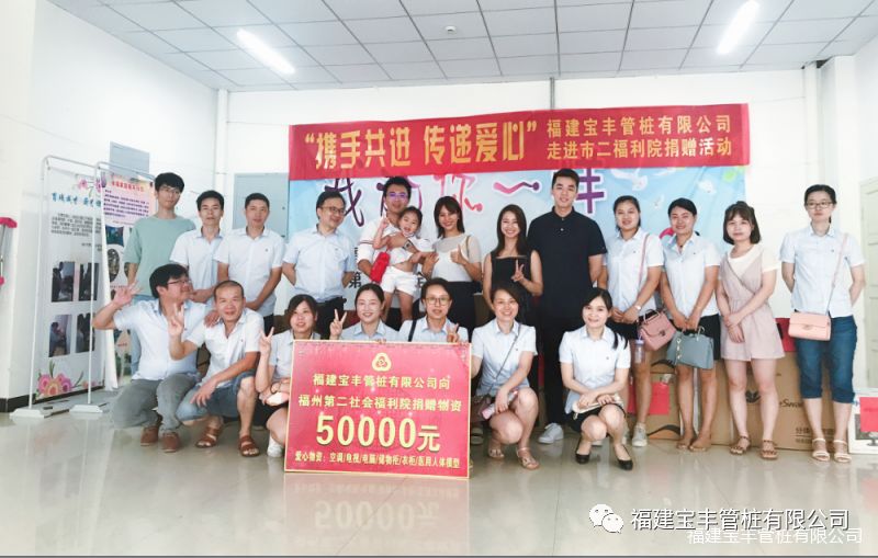 2018年7月23日八点半,福建宝丰管桩有限公司领导及员工走进了福州第二社会福利院,在这里举行“携手共进、传递爱心”捐赠活动。